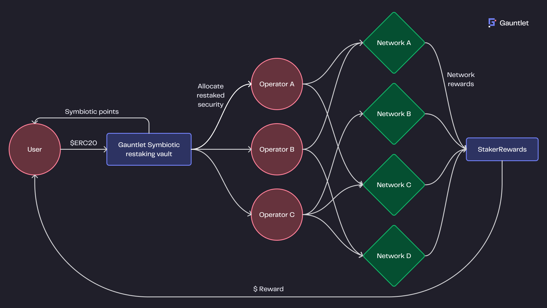 Les vaults servent de couche de staking flexible reliant le collatéral aux réseaux. Les utilisateurs peuvent déposer leur collatéral dans les vaults et bénéficier des récompenses de staker et des réseaux sous forme de rendement ajusté au risque. Des curateurs comme Gauntlet décident où allouer ce collatéral (sécurité partagée) et peuvent adapter le profil de risque de chaque vault en déterminant quels réseaux et opérateurs ont accès au collatéral.