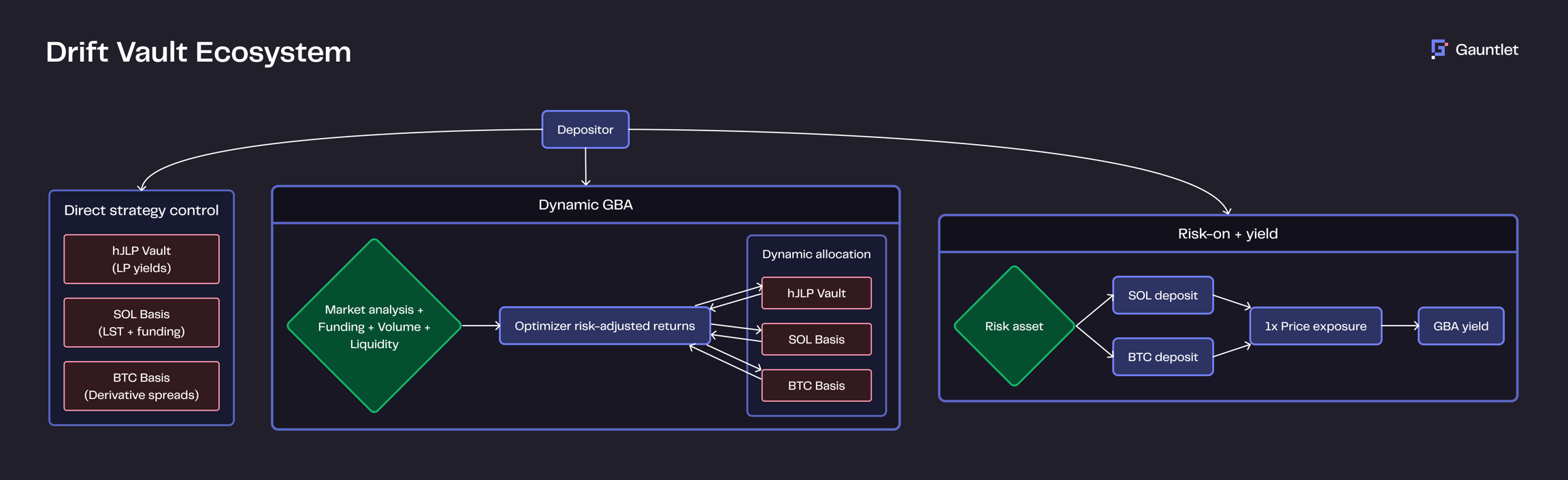 The Gauntlet Basis Alpha (GBA) strategy implements a portfolio view across all basis trades. Starting with allocations to hJLP, SOL LST, and BTC Basis Trades, it will continuously and autonomously rebalance based on real-time market conditions, considering funding rates, liquidity conditions, trading volumes, and historical performance patterns. This removes the need for active management while maintaining sophisticated optimization. New assets may be added in the future, see here for current allocations.
