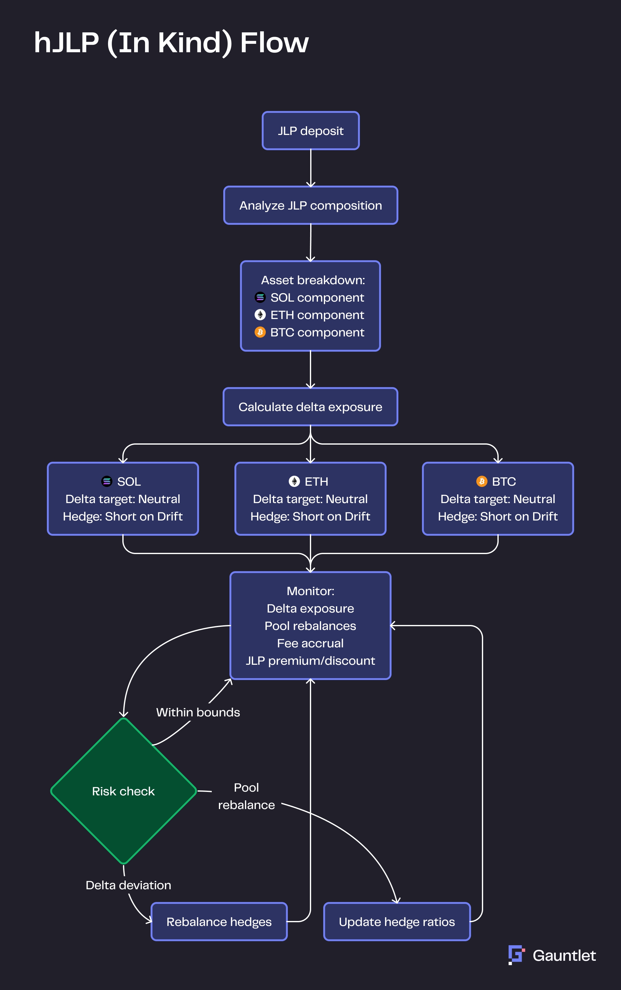 The In Kind JLP vault enables direct JLP token deposits while implementing hedging to protect against price movements of the JLP basket assets. Users maintain exposure to Jupiter's liquidity provision fees while neutralizing underlying price risks without needing to convert their tokens to USDC first.
