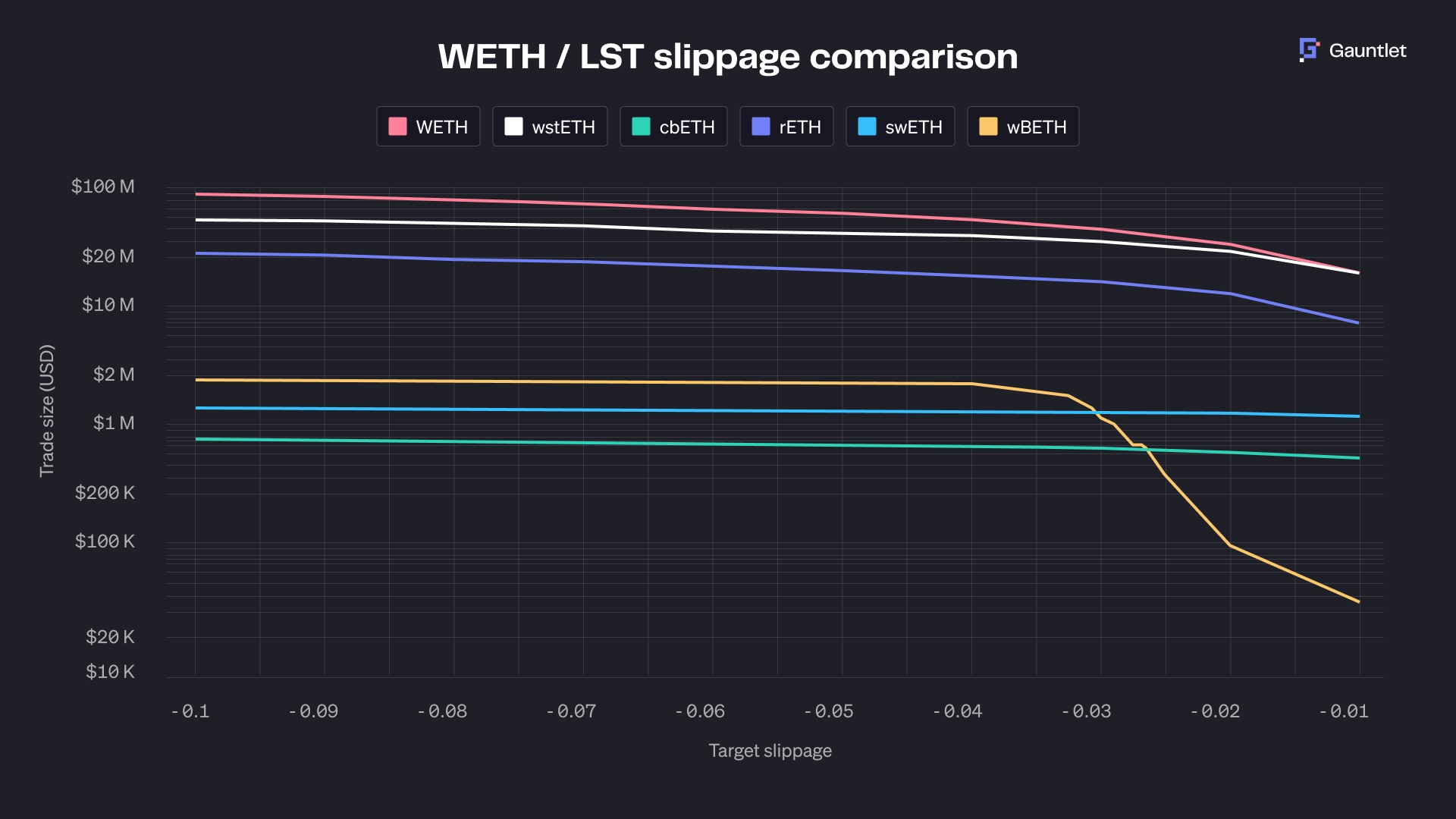 For example, a critical criterion in our evaluation is abundant market liquidity. Below are the slippage curves of each collateral’s DEX liquidity, with WETH (the top curve) as the benchmark. The CEX issuers of wBETH (Binance) and cbETH (Coinbase) also maintain deep liquidity of their LSTs.